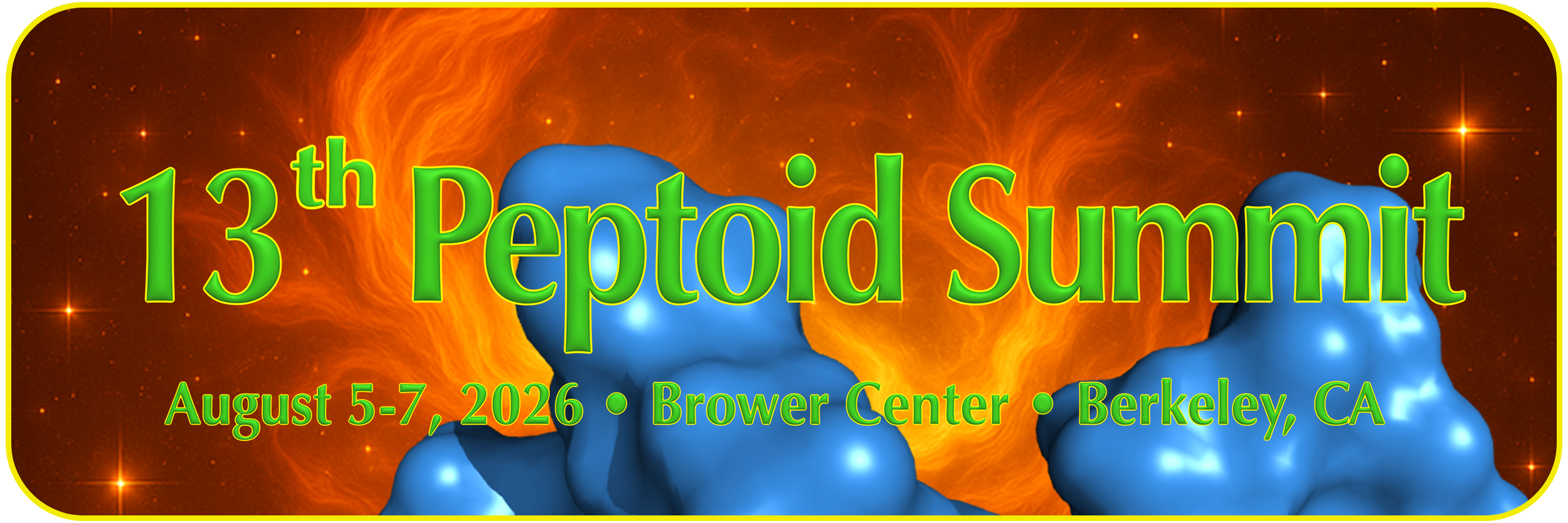 The 13th Peptoid Summit will be held in-person at a conference center in downtown Berkeley, CA (close to BART) on Wed-Fri, August 5-7, 2026. Registration provides access to all plenary lectures, poster sessions, lightning round sessions, catered breakfast, lunch, and snacks, a banquet dinner on Thursday 8/6, the BBQ/frisbee-fest, a PDF of the abstract book, and a free commemorative Ultra-Star 175g ultimate frisbee featuring the 13th Peptoid Summit logo.
