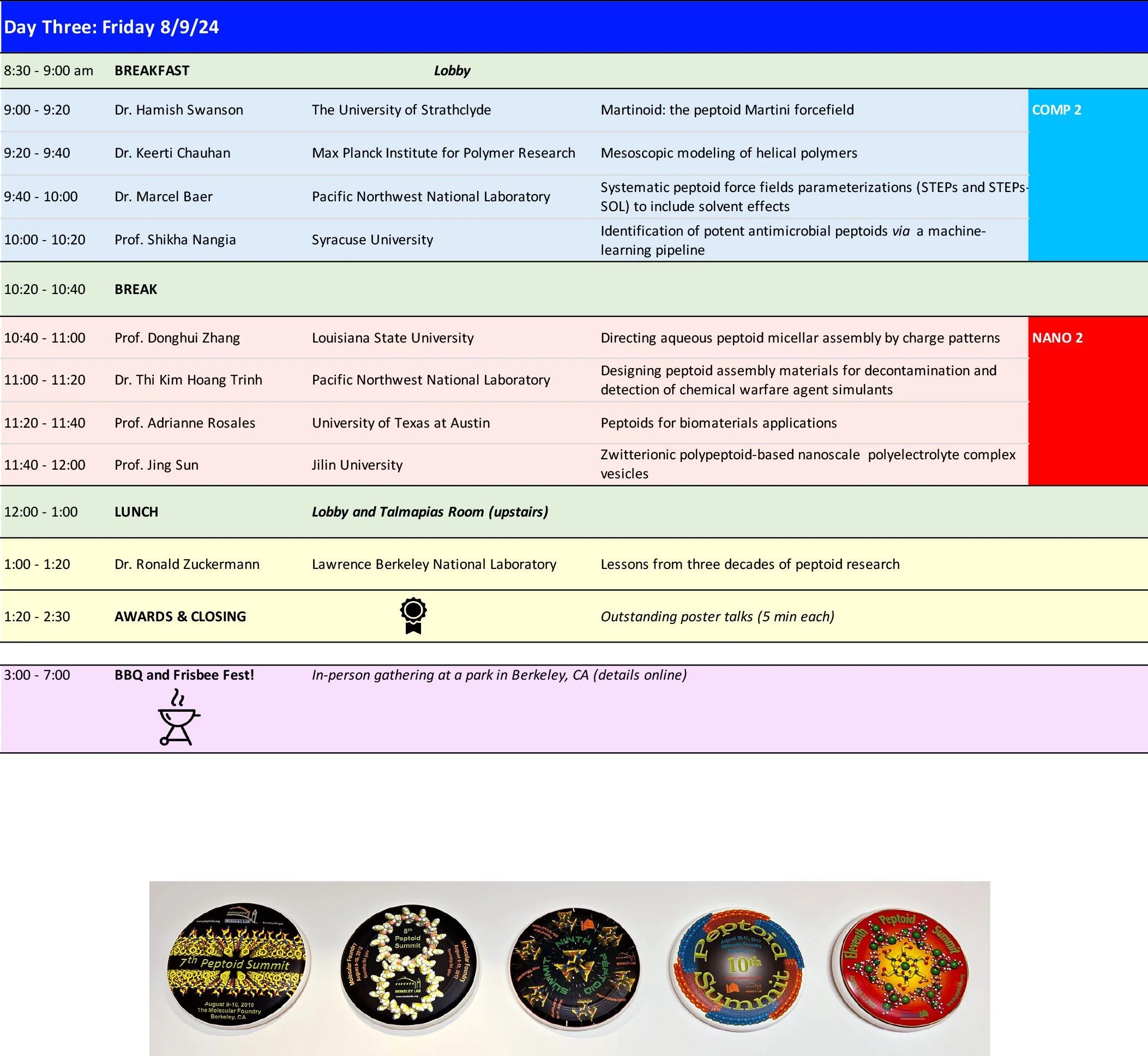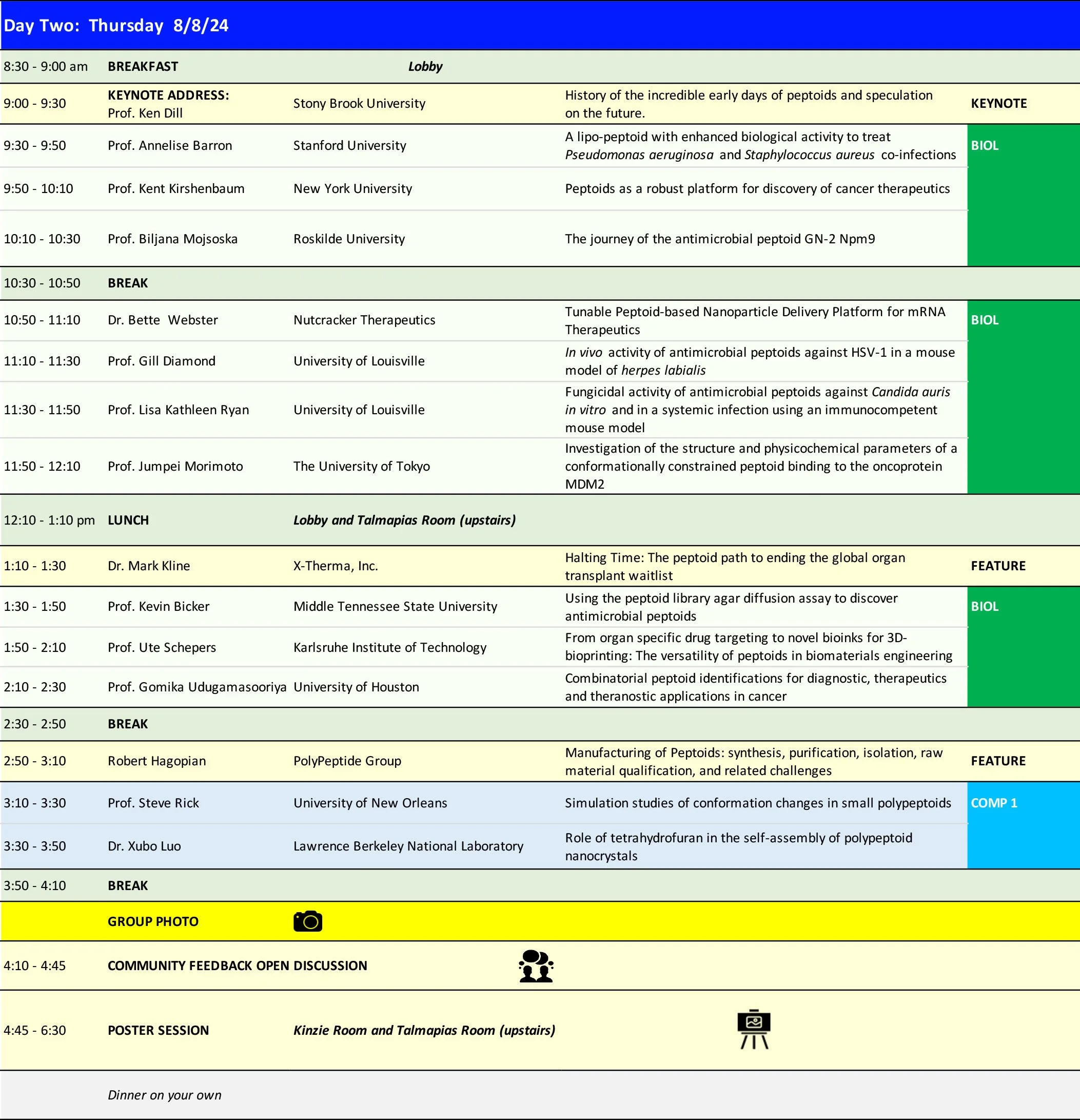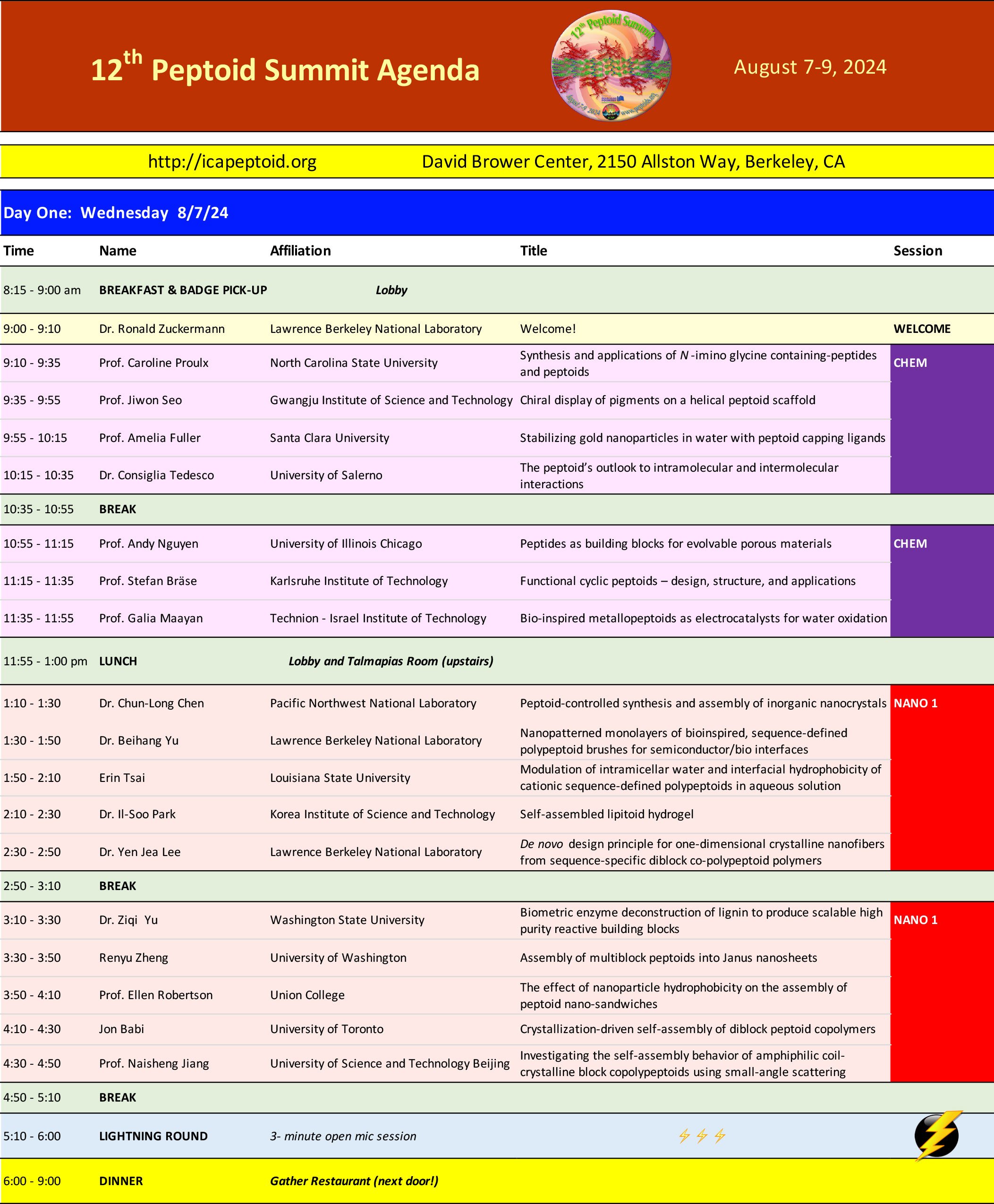 The oral program is shown below. For the full program including posters, click here. A 12th Peptoid Summit abstract book, containing all graphical abstracts (talks and posters), is available to all registrants.